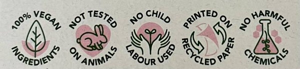 🌿100% Vegan ingrediënten, niet op dieren getest, geen kinderarbeid, verpakt in een gerecyclede verpakking en geen schadelijke chemicaliën.